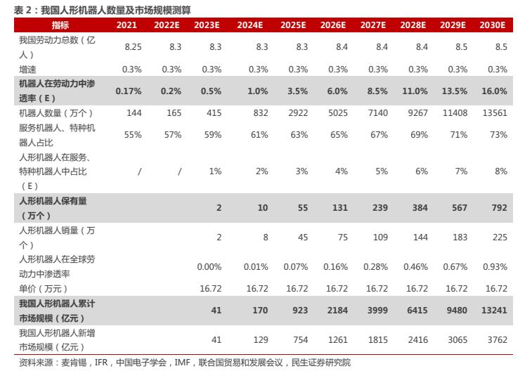 按照单个机器人价格16.72万元人民币计算,预计到2023年全球人形机器人年市场规模将达到365亿元,到2025年、2030年分别达到3908亿元、1.9万亿元。其中,预计我国人形机器人年市场规模到2025年、2030年将分别达到754亿元、3762亿元。